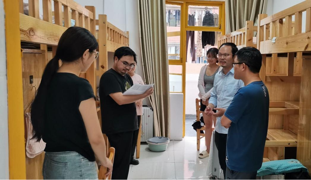 走进宿舍,唐运前仔细询问员工来自哪里?适应集体生活吗?生活上是否有困难?贴心的话迅速拉近了师生间的距离。刘燕仔细询问新生面对新环境是否适应?宿舍关系是否融洽?并对新生提出的问题给予解疑。石登红特别提醒员工,要谨防上当受骗,做好人身安全与财产安全的防范,在生活中遇到可疑情况及时向公司老师反映,共同营造安全的校园环境。杨文佳提醒员工,要尽快熟悉公司环境,尽快转变角色,主动适应大学新生活。