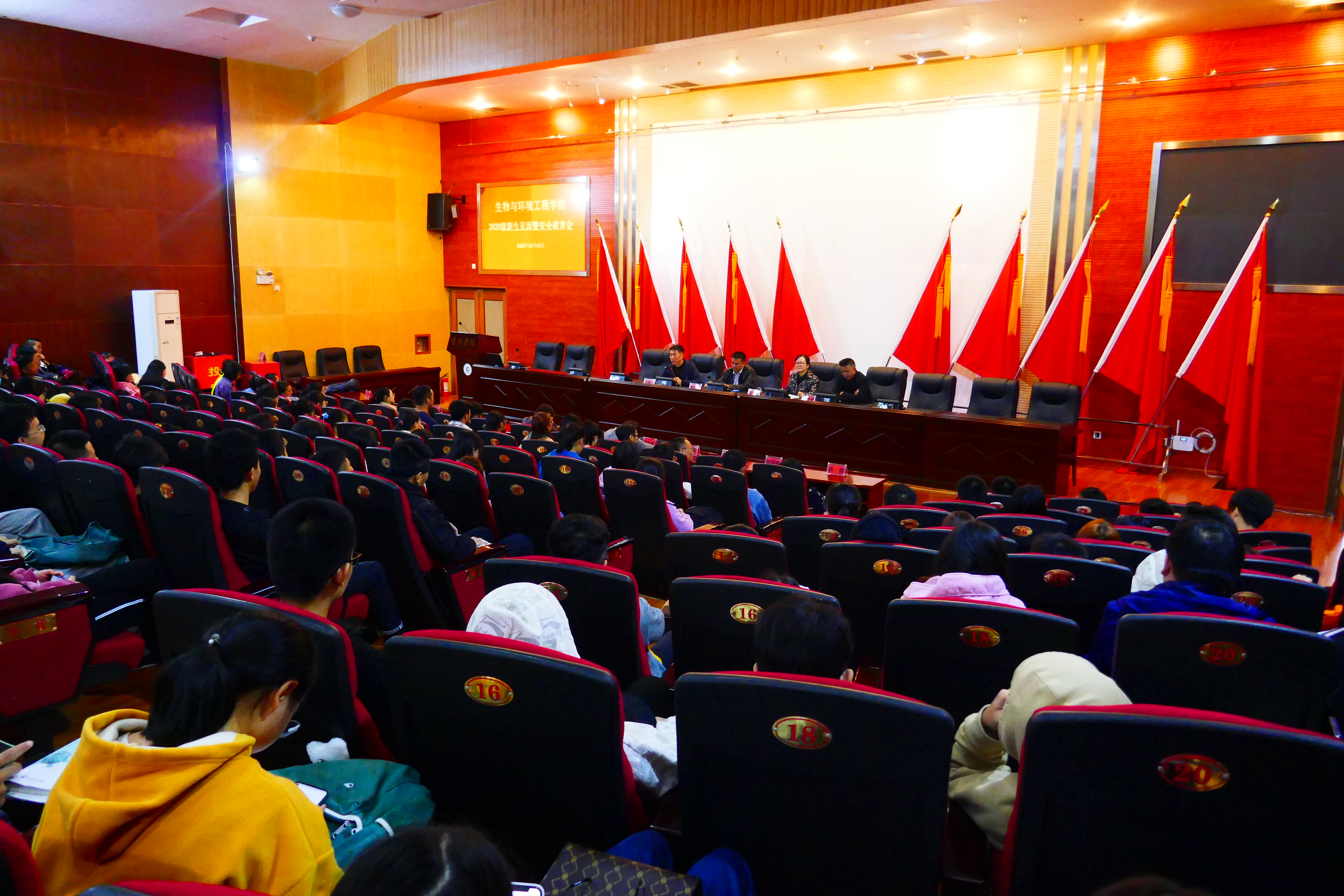 2020年10月14日下午,yl23455永利在图书馆报告厅举行2020级新生见面暨安全教育会,公司党总支书记唐运前、经理刘燕、党总支副书记高喜明、副经理叶孝勇、教研室主任、团总支副书记、辅导员、新生班主任以及全体2020级新生参会。党总支副书记高喜明主持会议。